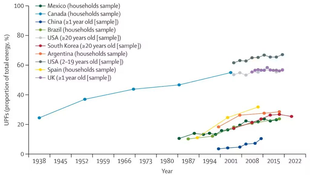 Aux États-Unis, au Royaume-Uni et au Canada, leur part dans l’alimentation est à des niveaux élevés depuis des décennies (environ 50 % de l’apport énergétique quotidien). Les aliments ultratransformés constituent l’essentiel du régime alimentaire national. Il en va de même en Australie.